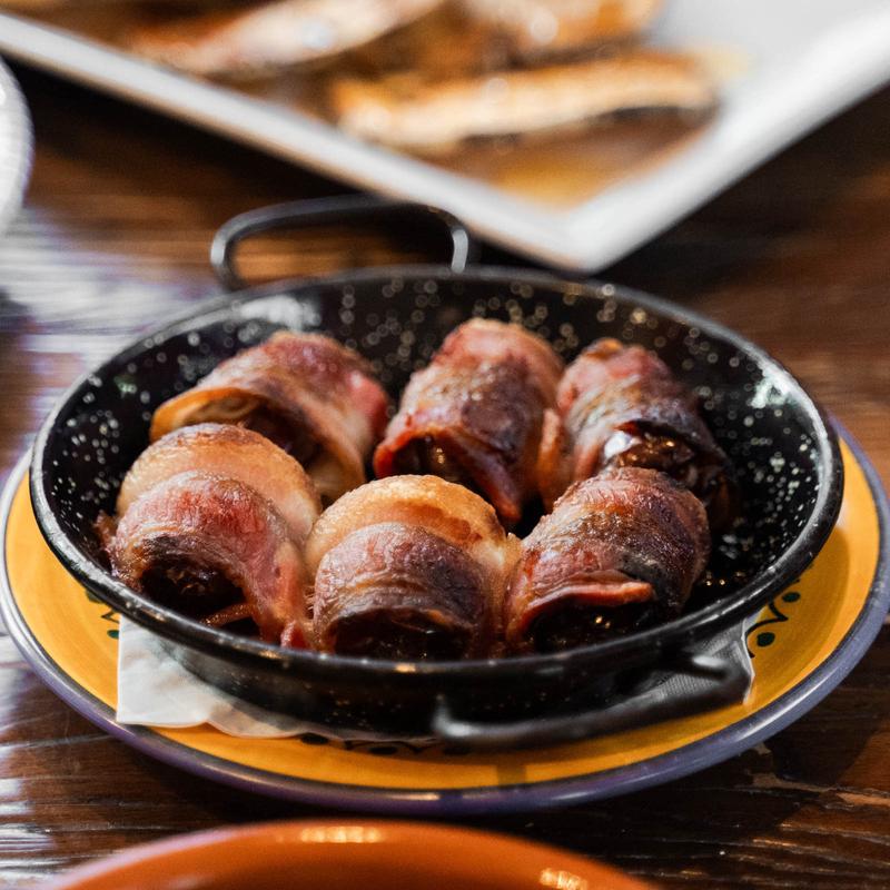 Bacon-wrapped Medjool dates stuffed with Manchego cheese.